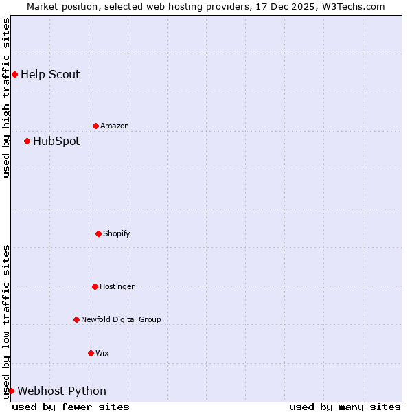 TechnologiesContent ManagementServer-side Languages Client-side Languages JavaScript Libraries CSS Frameworks Web Servers Web Panels Operating Systems Web Hosting Data Centers Reverse Proxies DNS Servers Email Servers SSL Certificate Authorities Content Delivery Traffic Analysis Tools Advertising Networks Tag Managers Social Widgets Site Elements Structured Data Markup Languages Character Encodings Image File Formats Top Level Domains Server Locations Content Languages | Technologies > Web Hosting > Technology usage comparison Comparison of the usage statistics of HubSpot vs. Help Scout vs. Webhost Python for websitesThis report shows the usage statistics of HubSpot vs. Help Scout vs. Webhost Python as web hosting provider on the web. See technologies overview for explanations on the methodologies used in the surveys. Our reports are updated daily. UsageThis diagram shows the percentages of websites using the selected technologies. How to read the diagram: