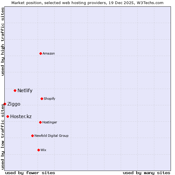 TechnologiesContent ManagementServer-side Languages Client-side Languages JavaScript Libraries CSS Frameworks Web Servers Web Panels Operating Systems Web Hosting Data Centers Reverse Proxies DNS Servers Email Servers SSL Certificate Authorities Content Delivery Traffic Analysis Tools Advertising Networks Tag Managers Social Widgets Site Elements Structured Data Markup Languages Character Encodings Image File Formats Top Level Domains Server Locations Content Languages | Technologies > Web Hosting > Technology usage comparison Comparison of the usage statistics of Netlify vs. Hoster.kz vs. Ziggo for websitesThis report shows the usage statistics of Netlify vs. Hoster.kz vs. Ziggo as web hosting provider on the web. See technologies overview for explanations on the methodologies used in the surveys. Our reports are updated daily. UsageThis diagram shows the percentages of websites using the selected technologies. How to read the diagram: