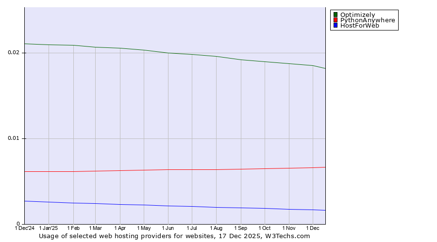 TechnologiesContent ManagementServer-side Languages Client-side Languages JavaScript Libraries CSS Frameworks Web Servers Web Panels Operating Systems Web Hosting Data Centers Reverse Proxies DNS Servers Email Servers SSL Certificate Authorities Content Delivery Traffic Analysis Tools Advertising Networks Tag Managers Social Widgets Site Elements Structured Data Markup Languages Character Encodings Image File Formats Top Level Domains Server Locations Content Languages | Technologies > Web Hosting > Technology usage comparison Comparison of the usage statistics of Optimizely vs. PythonAnywhere vs. HostForWeb for websitesThis report shows the usage statistics of Optimizely vs. PythonAnywhere vs. HostForWeb as web hosting provider on the web. See technologies overview for explanations on the methodologies used in the surveys. Our reports are updated daily. UsageThis diagram shows the percentages of websites using the selected technologies. How to read the diagram: