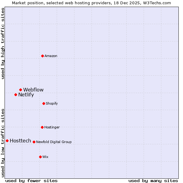 TechnologiesContent ManagementServer-side Languages Client-side Languages JavaScript Libraries CSS Frameworks Web Servers Web Panels Operating Systems Web Hosting Data Centers Reverse Proxies DNS Servers Email Servers SSL Certificate Authorities Content Delivery Traffic Analysis Tools Advertising Networks Tag Managers Social Widgets Site Elements Structured Data Markup Languages Character Encodings Image File Formats Top Level Domains Server Locations Content Languages | Technologies > Web Hosting > Technology usage comparison Comparison of the usage statistics of Webflow vs. Netlify vs. Hosttech for websitesThis report shows the usage statistics of Webflow vs. Netlify vs. Hosttech as web hosting provider on the web. See technologies overview for explanations on the methodologies used in the surveys. Our reports are updated daily. UsageThis diagram shows the percentages of websites using the selected technologies. How to read the diagram: