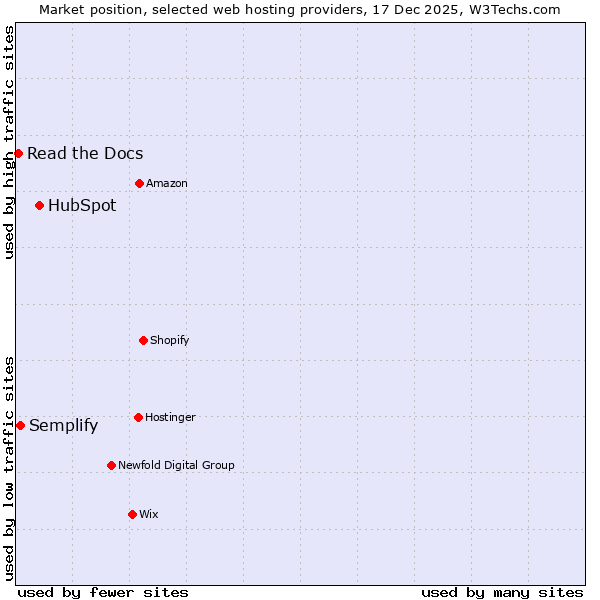 TechnologiesContent ManagementServer-side Languages Client-side Languages JavaScript Libraries CSS Frameworks Web Servers Web Panels Operating Systems Web Hosting Data Centers Reverse Proxies DNS Servers Email Servers SSL Certificate Authorities Content Delivery Traffic Analysis Tools Advertising Networks Tag Managers Social Widgets Site Elements Structured Data Markup Languages Character Encodings Image File Formats Top Level Domains Server Locations Content Languages | Technologies > Web Hosting > Technology usage comparison Comparison of the usage statistics of HubSpot vs. Semplify vs. Read the Docs for websitesThis report shows the usage statistics of HubSpot vs. Semplify vs. Read the Docs as web hosting provider on the web. See technologies overview for explanations on the methodologies used in the surveys. Our reports are updated daily. UsageThis diagram shows the percentages of websites using the selected technologies. How to read the diagram: