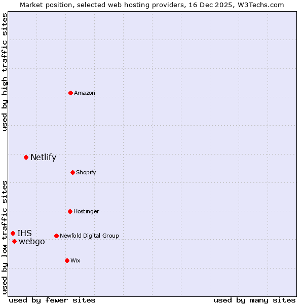 TechnologiesContent ManagementServer-side Languages Client-side Languages JavaScript Libraries CSS Frameworks Web Servers Web Panels Operating Systems Web Hosting Data Centers Reverse Proxies DNS Servers Email Servers SSL Certificate Authorities Content Delivery Traffic Analysis Tools Advertising Networks Tag Managers Social Widgets Site Elements Structured Data Markup Languages Character Encodings Image File Formats Top Level Domains Server Locations Content Languages | Technologies > Web Hosting > Technology usage comparison Comparison of the usage statistics of Netlify vs. webgo vs. IHS for websitesThis report shows the usage statistics of Netlify vs. webgo vs. IHS as web hosting provider on the web. See technologies overview for explanations on the methodologies used in the surveys. Our reports are updated daily. UsageThis diagram shows the percentages of websites using the selected technologies. How to read the diagram: