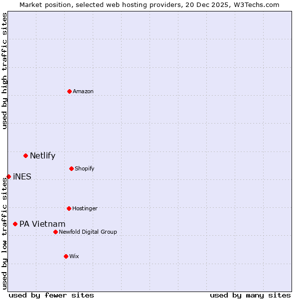 TechnologiesContent ManagementServer-side Languages Client-side Languages JavaScript Libraries CSS Frameworks Web Servers Web Panels Operating Systems Web Hosting Data Centers Reverse Proxies DNS Servers Email Servers SSL Certificate Authorities Content Delivery Traffic Analysis Tools Advertising Networks Tag Managers Social Widgets Site Elements Structured Data Markup Languages Character Encodings Image File Formats Top Level Domains Server Locations Content Languages | Technologies > Web Hosting > Technology usage comparison Comparison of the usage statistics of Netlify vs. PA Vietnam vs. iNES for websitesThis report shows the usage statistics of Netlify vs. PA Vietnam vs. iNES as web hosting provider on the web. See technologies overview for explanations on the methodologies used in the surveys. Our reports are updated daily. UsageThis diagram shows the percentages of websites using the selected technologies. How to read the diagram: