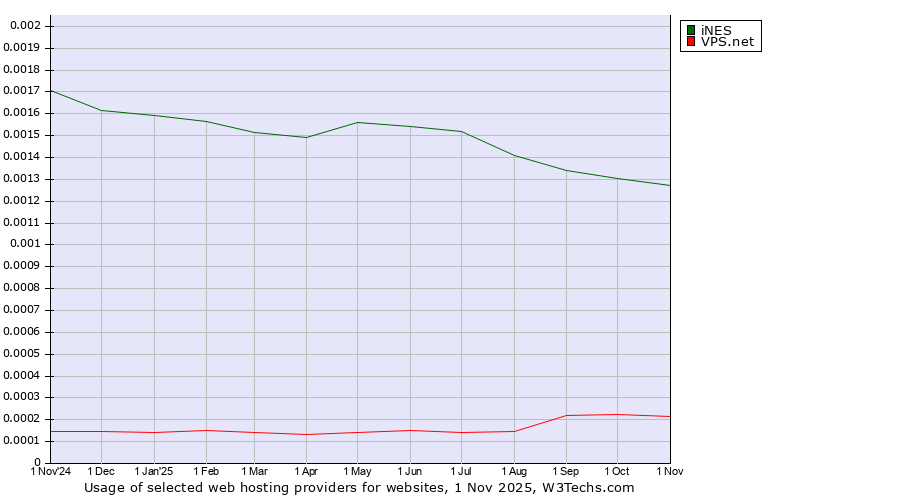 TechnologiesContent ManagementServer-side Languages Client-side Languages JavaScript Libraries CSS Frameworks Web Servers Web Panels Operating Systems Web Hosting Data Centers Reverse Proxies DNS Servers Email Servers SSL Certificate Authorities Content Delivery Traffic Analysis Tools Advertising Networks Tag Managers Social Widgets Site Elements Structured Data Markup Languages Character Encodings Image File Formats Top Level Domains Server Locations Content Languages ComparisonCompare with other | Technologies > Web Hosting > Technology usage comparison Comparison of the usage statistics of iNES vs. VPS.net for websitesThis report shows the usage statistics of iNES vs. VPS.net as web hosting provider on the web. See technologies overview for explanations on the methodologies used in the surveys. Our reports are updated daily. UsageThis diagram shows the percentages of websites using the selected technologies. How to read the diagram: