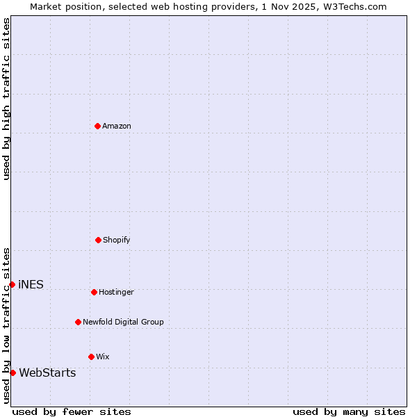 TechnologiesContent ManagementServer-side Languages Client-side Languages JavaScript Libraries CSS Frameworks Web Servers Web Panels Operating Systems Web Hosting Data Centers Reverse Proxies DNS Servers Email Servers SSL Certificate Authorities Content Delivery Traffic Analysis Tools Advertising Networks Tag Managers Social Widgets Site Elements Structured Data Markup Languages Character Encodings Image File Formats Top Level Domains Server Locations Content Languages ComparisonCompare with other | Technologies > Web Hosting > Technology usage comparison Comparison of the usage statistics of WebStarts vs. iNES for websitesThis report shows the usage statistics of WebStarts vs. iNES as web hosting provider on the web. See technologies overview for explanations on the methodologies used in the surveys. Our reports are updated daily. UsageThis diagram shows the percentages of websites using the selected technologies. How to read the diagram: