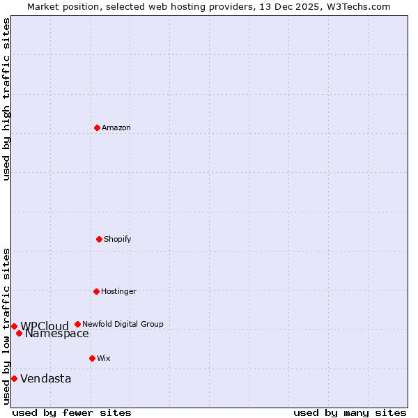 TechnologiesContent ManagementServer-side Languages Client-side Languages JavaScript Libraries CSS Frameworks Web Servers Web Panels Operating Systems Web Hosting Data Centers Reverse Proxies DNS Servers Email Servers SSL Certificate Authorities Content Delivery Traffic Analysis Tools Advertising Networks Tag Managers Social Widgets Site Elements Structured Data Markup Languages Character Encodings Image File Formats Top Level Domains Server Locations Content Languages | Technologies > Web Hosting > Technology usage comparison Comparison of the usage statistics of Namespace vs. Vendasta vs. WPCloud for websitesThis report shows the usage statistics of Namespace vs. Vendasta vs. WPCloud as web hosting provider on the web. See technologies overview for explanations on the methodologies used in the surveys. Our reports are updated daily. UsageThis diagram shows the percentages of websites using the selected technologies. How to read the diagram: