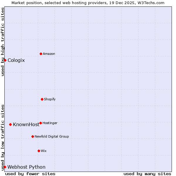 TechnologiesContent ManagementServer-side Languages Client-side Languages JavaScript Libraries CSS Frameworks Web Servers Web Panels Operating Systems Web Hosting Data Centers Reverse Proxies DNS Servers Email Servers SSL Certificate Authorities Content Delivery Traffic Analysis Tools Advertising Networks Tag Managers Social Widgets Site Elements Structured Data Markup Languages Character Encodings Image File Formats Top Level Domains Server Locations Content Languages | Technologies > Web Hosting > Technology usage comparison Comparison of the usage statistics of KnownHost vs. Cologix vs. Webhost Python for websitesThis report shows the usage statistics of KnownHost vs. Cologix vs. Webhost Python as web hosting provider on the web. See technologies overview for explanations on the methodologies used in the surveys. Our reports are updated daily. UsageThis diagram shows the percentages of websites using the selected technologies. How to read the diagram: