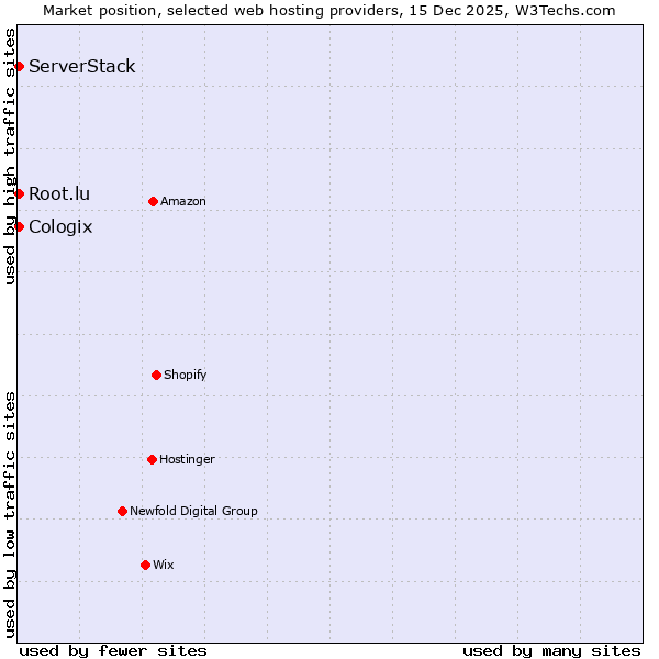 TechnologiesContent ManagementServer-side Languages Client-side Languages JavaScript Libraries CSS Frameworks Web Servers Web Panels Operating Systems Web Hosting Data Centers Reverse Proxies DNS Servers Email Servers SSL Certificate Authorities Content Delivery Traffic Analysis Tools Advertising Networks Tag Managers Social Widgets Site Elements Structured Data Markup Languages Character Encodings Image File Formats Top Level Domains Server Locations Content Languages | Technologies > Web Hosting > Technology usage comparison Comparison of the usage statistics of Cologix vs. Root.lu vs. ServerStack for websitesThis report shows the usage statistics of Cologix vs. Root.lu vs. ServerStack as web hosting provider on the web. See technologies overview for explanations on the methodologies used in the surveys. Our reports are updated daily. UsageThis diagram shows the percentages of websites using the selected technologies. How to read the diagram: