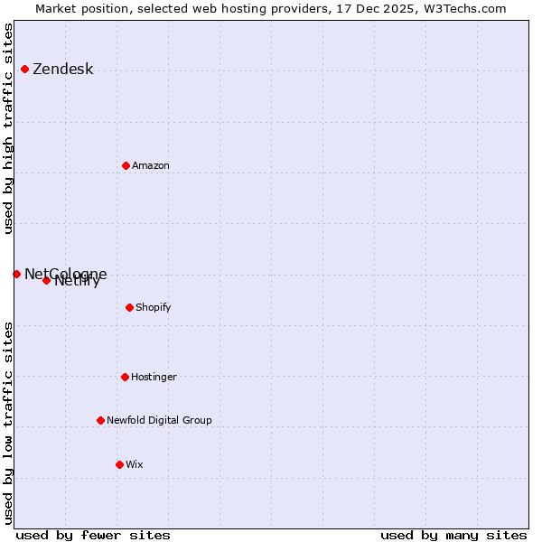 TechnologiesContent ManagementServer-side Languages Client-side Languages JavaScript Libraries CSS Frameworks Web Servers Web Panels Operating Systems Web Hosting Data Centers Reverse Proxies DNS Servers Email Servers SSL Certificate Authorities Content Delivery Traffic Analysis Tools Advertising Networks Tag Managers Social Widgets Site Elements Structured Data Markup Languages Character Encodings Image File Formats Top Level Domains Server Locations Content Languages | Technologies > Web Hosting > Technology usage comparison Comparison of the usage statistics of Netlify vs. Zendesk vs. NetCologne for websitesThis report shows the usage statistics of Netlify vs. Zendesk vs. NetCologne as web hosting provider on the web. See technologies overview for explanations on the methodologies used in the surveys. Our reports are updated daily. UsageThis diagram shows the percentages of websites using the selected technologies. How to read the diagram: