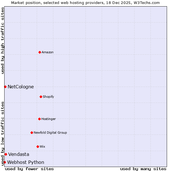 TechnologiesContent ManagementServer-side Languages Client-side Languages JavaScript Libraries CSS Frameworks Web Servers Web Panels Operating Systems Web Hosting Data Centers Reverse Proxies DNS Servers Email Servers SSL Certificate Authorities Content Delivery Traffic Analysis Tools Advertising Networks Tag Managers Social Widgets Site Elements Structured Data Markup Languages Character Encodings Image File Formats Top Level Domains Server Locations Content Languages | Technologies > Web Hosting > Technology usage comparison Comparison of the usage statistics of Vendasta vs. NetCologne vs. Webhost Python for websitesThis report shows the usage statistics of Vendasta vs. NetCologne vs. Webhost Python as web hosting provider on the web. See technologies overview for explanations on the methodologies used in the surveys. Our reports are updated daily. UsageThis diagram shows the percentages of websites using the selected technologies. How to read the diagram: