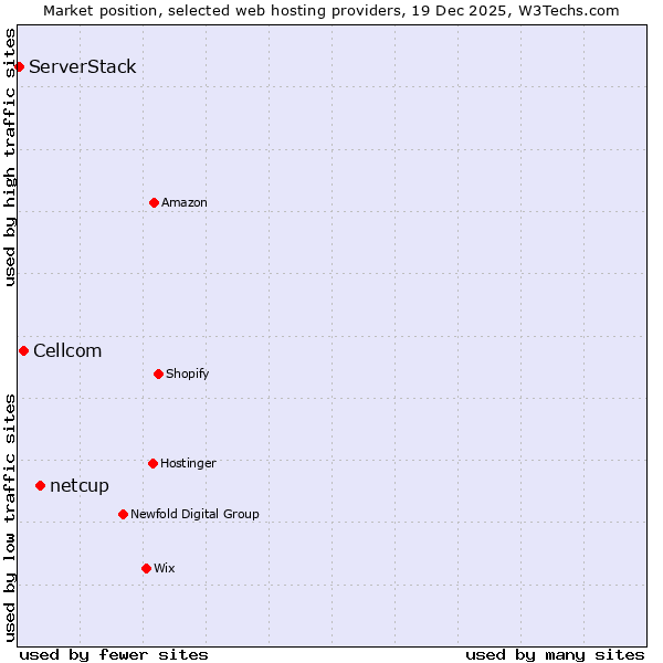 TechnologiesContent ManagementServer-side Languages Client-side Languages JavaScript Libraries CSS Frameworks Web Servers Web Panels Operating Systems Web Hosting Data Centers Reverse Proxies DNS Servers Email Servers SSL Certificate Authorities Content Delivery Traffic Analysis Tools Advertising Networks Tag Managers Social Widgets Site Elements Structured Data Markup Languages Character Encodings Image File Formats Top Level Domains Server Locations Content Languages | Technologies > Web Hosting > Technology usage comparison Comparison of the usage statistics of netcup vs. Cellcom vs. ServerStack for websitesThis report shows the usage statistics of netcup vs. Cellcom vs. ServerStack as web hosting provider on the web. See technologies overview for explanations on the methodologies used in the surveys. Our reports are updated daily. UsageThis diagram shows the percentages of websites using the selected technologies. How to read the diagram: