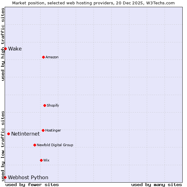 TechnologiesContent ManagementServer-side Languages Client-side Languages JavaScript Libraries CSS Frameworks Web Servers Web Panels Operating Systems Web Hosting Data Centers Reverse Proxies DNS Servers Email Servers SSL Certificate Authorities Content Delivery Traffic Analysis Tools Advertising Networks Tag Managers Social Widgets Site Elements Structured Data Markup Languages Character Encodings Image File Formats Top Level Domains Server Locations Content Languages | Technologies > Web Hosting > Technology usage comparison Comparison of the usage statistics of Netinternet vs. Wake vs. Webhost Python for websitesThis report shows the usage statistics of Netinternet vs. Wake vs. Webhost Python as web hosting provider on the web. See technologies overview for explanations on the methodologies used in the surveys. Our reports are updated daily. UsageThis diagram shows the percentages of websites using the selected technologies. How to read the diagram: