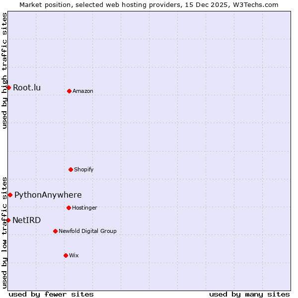 TechnologiesContent ManagementServer-side Languages Client-side Languages JavaScript Libraries CSS Frameworks Web Servers Web Panels Operating Systems Web Hosting Data Centers Reverse Proxies DNS Servers Email Servers SSL Certificate Authorities Content Delivery Traffic Analysis Tools Advertising Networks Tag Managers Social Widgets Site Elements Structured Data Markup Languages Character Encodings Image File Formats Top Level Domains Server Locations Content Languages | Technologies > Web Hosting > Technology usage comparison Comparison of the usage statistics of PythonAnywhere vs. Root.lu vs. NetIRD for websitesThis report shows the usage statistics of PythonAnywhere vs. Root.lu vs. NetIRD as web hosting provider on the web. See technologies overview for explanations on the methodologies used in the surveys. Our reports are updated daily. UsageThis diagram shows the percentages of websites using the selected technologies. How to read the diagram: