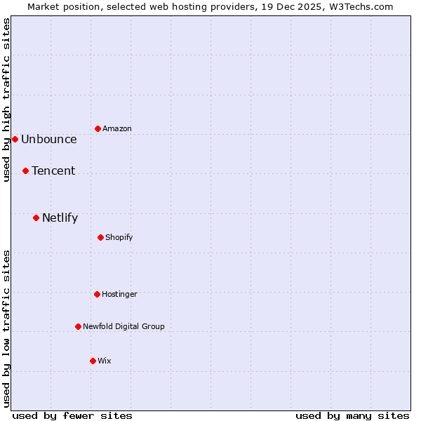 TechnologiesContent ManagementServer-side Languages Client-side Languages JavaScript Libraries CSS Frameworks Web Servers Web Panels Operating Systems Web Hosting Data Centers Reverse Proxies DNS Servers Email Servers SSL Certificate Authorities Content Delivery Traffic Analysis Tools Advertising Networks Tag Managers Social Widgets Site Elements Structured Data Markup Languages Character Encodings Image File Formats Top Level Domains Server Locations Content Languages | Technologies > Web Hosting > Technology usage comparison Comparison of the usage statistics of Netlify vs. Tencent vs. Unbounce for websitesThis report shows the usage statistics of Netlify vs. Tencent vs. Unbounce as web hosting provider on the web. See technologies overview for explanations on the methodologies used in the surveys. Our reports are updated daily. UsageThis diagram shows the percentages of websites using the selected technologies. How to read the diagram: