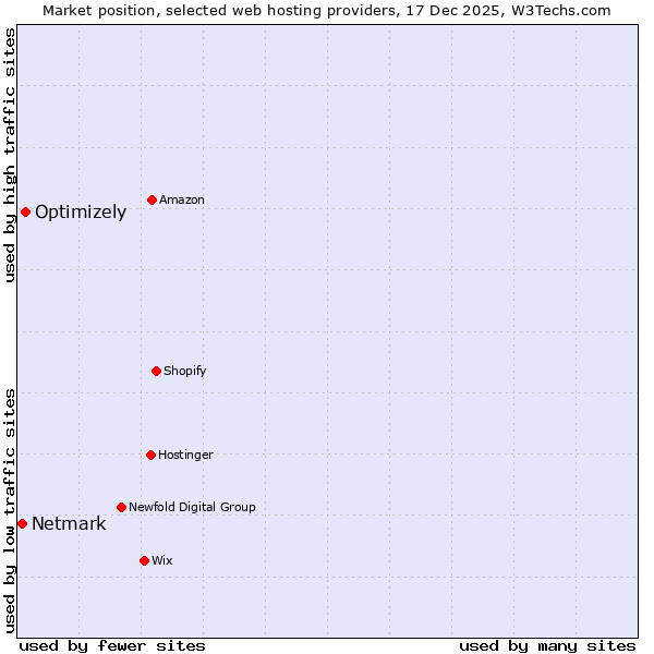 TechnologiesContent ManagementServer-side Languages Client-side Languages JavaScript Libraries CSS Frameworks Web Servers Web Panels Operating Systems Web Hosting Data Centers Reverse Proxies DNS Servers Email Servers SSL Certificate Authorities Content Delivery Traffic Analysis Tools Advertising Networks Tag Managers Social Widgets Site Elements Structured Data Markup Languages Character Encodings Image File Formats Top Level Domains Server Locations Content Languages ComparisonCompare with other | Technologies > Web Hosting > Technology usage comparison Comparison of the usage statistics of Optimizely vs. Netmark for websitesThis report shows the usage statistics of Optimizely vs. Netmark as web hosting provider on the web. See technologies overview for explanations on the methodologies used in the surveys. Our reports are updated daily. UsageThis diagram shows the percentages of websites using the selected technologies. How to read the diagram: