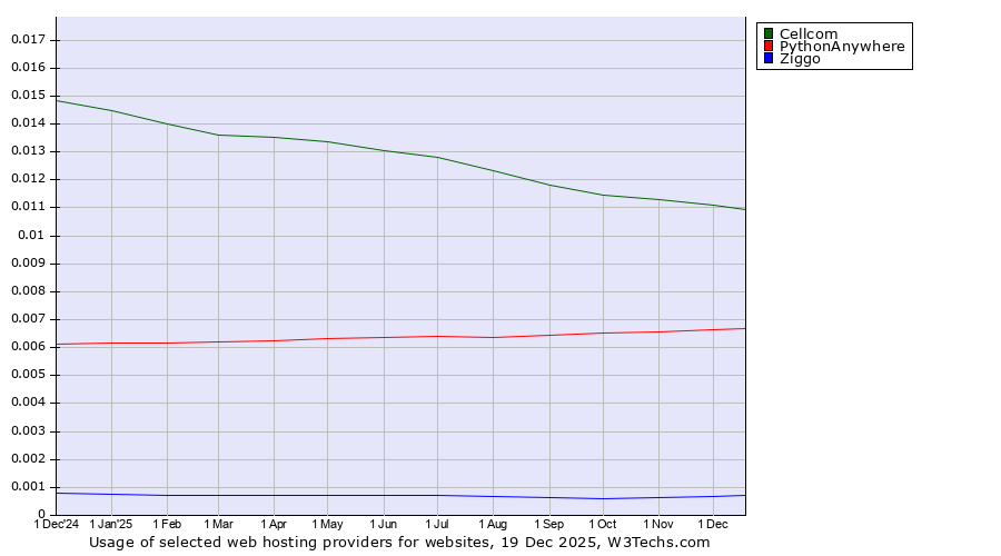 TechnologiesContent ManagementServer-side Languages Client-side Languages JavaScript Libraries CSS Frameworks Web Servers Web Panels Operating Systems Web Hosting Data Centers Reverse Proxies DNS Servers Email Servers SSL Certificate Authorities Content Delivery Traffic Analysis Tools Advertising Networks Tag Managers Social Widgets Site Elements Structured Data Markup Languages Character Encodings Image File Formats Top Level Domains Server Locations Content Languages | Technologies > Web Hosting > Technology usage comparison Comparison of the usage statistics of Cellcom vs. PythonAnywhere vs. Ziggo for websitesThis report shows the usage statistics of Cellcom vs. PythonAnywhere vs. Ziggo as web hosting provider on the web. See technologies overview for explanations on the methodologies used in the surveys. Our reports are updated daily. UsageThis diagram shows the percentages of websites using the selected technologies. How to read the diagram:
