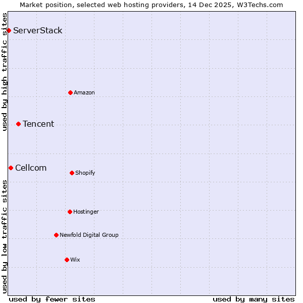 TechnologiesContent ManagementServer-side Languages Client-side Languages JavaScript Libraries CSS Frameworks Web Servers Web Panels Operating Systems Web Hosting Data Centers Reverse Proxies DNS Servers Email Servers SSL Certificate Authorities Content Delivery Traffic Analysis Tools Advertising Networks Tag Managers Social Widgets Site Elements Structured Data Markup Languages Character Encodings Image File Formats Top Level Domains Server Locations Content Languages | Technologies > Web Hosting > Technology usage comparison Comparison of the usage statistics of Tencent vs. Cellcom vs. ServerStack for websitesThis report shows the usage statistics of Tencent vs. Cellcom vs. ServerStack as web hosting provider on the web. See technologies overview for explanations on the methodologies used in the surveys. Our reports are updated daily. UsageThis diagram shows the percentages of websites using the selected technologies. How to read the diagram: