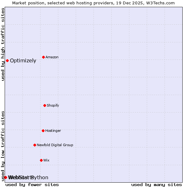 TechnologiesContent ManagementServer-side Languages Client-side Languages JavaScript Libraries CSS Frameworks Web Servers Web Panels Operating Systems Web Hosting Data Centers Reverse Proxies DNS Servers Email Servers SSL Certificate Authorities Content Delivery Traffic Analysis Tools Advertising Networks Tag Managers Social Widgets Site Elements Structured Data Markup Languages Character Encodings Image File Formats Top Level Domains Server Locations Content Languages | Technologies > Web Hosting > Technology usage comparison Comparison of the usage statistics of Optimizely vs. WebStarts vs. Webhost Python for websitesThis report shows the usage statistics of Optimizely vs. WebStarts vs. Webhost Python as web hosting provider on the web. See technologies overview for explanations on the methodologies used in the surveys. Our reports are updated daily. UsageThis diagram shows the percentages of websites using the selected technologies. How to read the diagram: