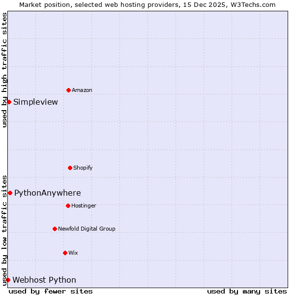 TechnologiesContent ManagementServer-side Languages Client-side Languages JavaScript Libraries CSS Frameworks Web Servers Web Panels Operating Systems Web Hosting Data Centers Reverse Proxies DNS Servers Email Servers SSL Certificate Authorities Content Delivery Traffic Analysis Tools Advertising Networks Tag Managers Social Widgets Site Elements Structured Data Markup Languages Character Encodings Image File Formats Top Level Domains Server Locations Content Languages | Technologies > Web Hosting > Technology usage comparison Comparison of the usage statistics of PythonAnywhere vs. Simpleview vs. Webhost Python for websitesThis report shows the usage statistics of PythonAnywhere vs. Simpleview vs. Webhost Python as web hosting provider on the web. See technologies overview for explanations on the methodologies used in the surveys. Our reports are updated daily. UsageThis diagram shows the percentages of websites using the selected technologies. How to read the diagram: