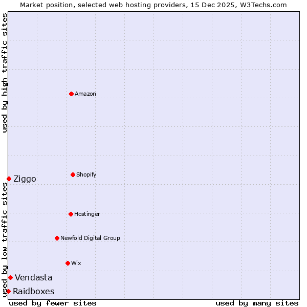 TechnologiesContent ManagementServer-side Languages Client-side Languages JavaScript Libraries CSS Frameworks Web Servers Web Panels Operating Systems Web Hosting Data Centers Reverse Proxies DNS Servers Email Servers SSL Certificate Authorities Content Delivery Traffic Analysis Tools Advertising Networks Tag Managers Social Widgets Site Elements Structured Data Markup Languages Character Encodings Image File Formats Top Level Domains Server Locations Content Languages | Technologies > Web Hosting > Technology usage comparison Comparison of the usage statistics of Vendasta vs. Ziggo vs. Raidboxes for websitesThis report shows the usage statistics of Vendasta vs. Ziggo vs. Raidboxes as web hosting provider on the web. See technologies overview for explanations on the methodologies used in the surveys. Our reports are updated daily. UsageThis diagram shows the percentages of websites using the selected technologies. How to read the diagram: