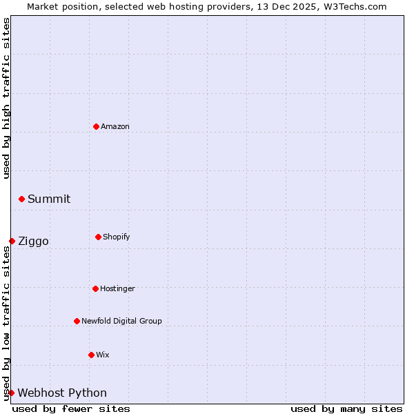 TechnologiesContent ManagementServer-side Languages Client-side Languages JavaScript Libraries CSS Frameworks Web Servers Web Panels Operating Systems Web Hosting Data Centers Reverse Proxies DNS Servers Email Servers SSL Certificate Authorities Content Delivery Traffic Analysis Tools Advertising Networks Tag Managers Social Widgets Site Elements Structured Data Markup Languages Character Encodings Image File Formats Top Level Domains Server Locations Content Languages | Technologies > Web Hosting > Technology usage comparison Comparison of the usage statistics of Summit vs. Ziggo vs. Webhost Python for websitesThis report shows the usage statistics of Summit vs. Ziggo vs. Webhost Python as web hosting provider on the web. See technologies overview for explanations on the methodologies used in the surveys. Our reports are updated daily. UsageThis diagram shows the percentages of websites using the selected technologies. How to read the diagram: