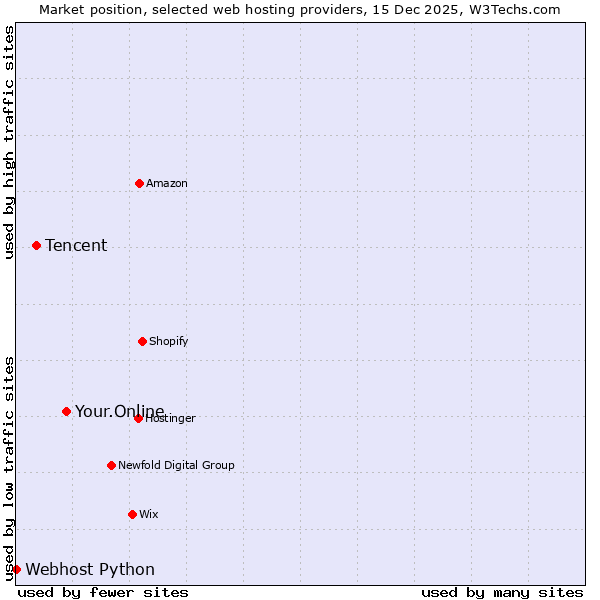 TechnologiesContent ManagementServer-side Languages Client-side Languages JavaScript Libraries CSS Frameworks Web Servers Web Panels Operating Systems Web Hosting Data Centers Reverse Proxies DNS Servers Email Servers SSL Certificate Authorities Content Delivery Traffic Analysis Tools Advertising Networks Tag Managers Social Widgets Site Elements Structured Data Markup Languages Character Encodings Image File Formats Top Level Domains Server Locations Content Languages | Technologies > Web Hosting > Technology usage comparison Comparison of the usage statistics of Your.Online vs. Tencent vs. Webhost Python for websitesThis report shows the usage statistics of Your.Online vs. Tencent vs. Webhost Python as web hosting provider on the web. See technologies overview for explanations on the methodologies used in the surveys. Our reports are updated daily. UsageThis diagram shows the percentages of websites using the selected technologies. How to read the diagram: