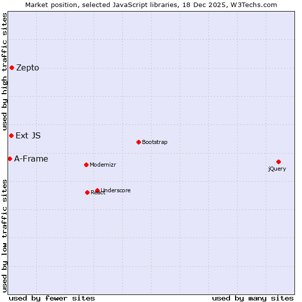 TechnologiesContent ManagementServer-side Languages Client-side Languages JavaScript Libraries CSS Frameworks Web Servers Web Panels Operating Systems Web Hosting Data Centers Reverse Proxies DNS Servers Email Servers SSL Certificate Authorities Content Delivery Traffic Analysis Tools Advertising Networks Tag Managers Social Widgets Site Elements Structured Data Markup Languages Character Encodings Image File Formats Top Level Domains Server Locations Content Languages | Technologies > JavaScript Libraries > Technology usage comparison Comparison of the usage statistics of Zepto vs. Ext JS vs. A-Frame for websitesThis report shows the usage statistics of Zepto vs. Ext JS vs. A-Frame as JavaScript library on the web. See technologies overview for explanations on the methodologies used in the surveys. Our reports are updated daily. Usage and market shareThis diagram shows the percentages of websites using the selected technologies. How to read the diagram: