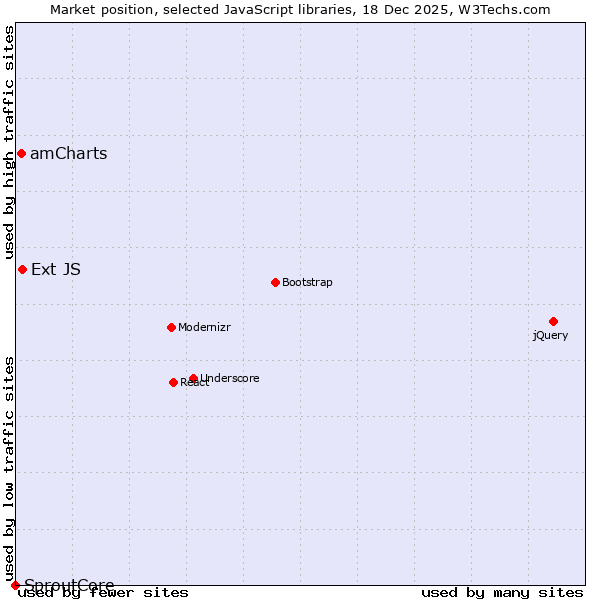TechnologiesContent ManagementServer-side Languages Client-side Languages JavaScript Libraries CSS Frameworks Web Servers Web Panels Operating Systems Web Hosting Data Centers Reverse Proxies DNS Servers Email Servers SSL Certificate Authorities Content Delivery Traffic Analysis Tools Advertising Networks Tag Managers Social Widgets Site Elements Structured Data Markup Languages Character Encodings Image File Formats Top Level Domains Server Locations Content Languages | Technologies > JavaScript Libraries > Technology usage comparison Comparison of the usage statistics of Ext JS vs. amCharts vs. SproutCore for websitesThis report shows the usage statistics of Ext JS vs. amCharts vs. SproutCore as JavaScript library on the web. See technologies overview for explanations on the methodologies used in the surveys. Our reports are updated daily. Usage and market shareThis diagram shows the percentages of websites using the selected technologies. How to read the diagram: