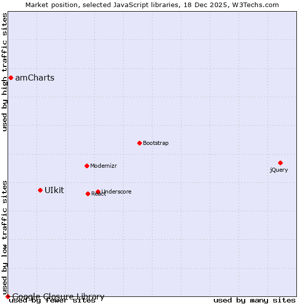 TechnologiesContent ManagementServer-side Languages Client-side Languages JavaScript Libraries CSS Frameworks Web Servers Web Panels Operating Systems Web Hosting Data Centers Reverse Proxies DNS Servers Email Servers SSL Certificate Authorities Content Delivery Traffic Analysis Tools Advertising Networks Tag Managers Social Widgets Site Elements Structured Data Markup Languages Character Encodings Image File Formats Top Level Domains Server Locations Content Languages | Technologies > JavaScript Libraries > Technology usage comparison Comparison of the usage statistics of UIkit vs. amCharts vs. Google Closure Library for websitesThis report shows the usage statistics of UIkit vs. amCharts vs. Google Closure Library as JavaScript library on the web. See technologies overview for explanations on the methodologies used in the surveys. Our reports are updated daily. Usage and market shareThis diagram shows the percentages of websites using the selected technologies. How to read the diagram:
