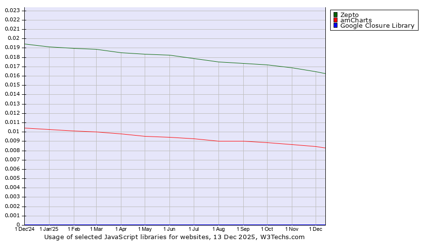 TechnologiesContent ManagementServer-side Languages Client-side Languages JavaScript Libraries CSS Frameworks Web Servers Web Panels Operating Systems Web Hosting Data Centers Reverse Proxies DNS Servers Email Servers SSL Certificate Authorities Content Delivery Traffic Analysis Tools Advertising Networks Tag Managers Social Widgets Site Elements Structured Data Markup Languages Character Encodings Image File Formats Top Level Domains Server Locations Content Languages | Technologies > JavaScript Libraries > Technology usage comparison Comparison of the usage statistics of Zepto vs. amCharts vs. Google Closure Library for websitesThis report shows the usage statistics of Zepto vs. amCharts vs. Google Closure Library as JavaScript library on the web. See technologies overview for explanations on the methodologies used in the surveys. Our reports are updated daily. Usage and market shareThis diagram shows the percentages of websites using the selected technologies. How to read the diagram: