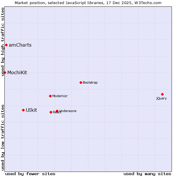 TechnologiesContent ManagementServer-side Languages Client-side Languages JavaScript Libraries CSS Frameworks Web Servers Web Panels Operating Systems Web Hosting Data Centers Reverse Proxies DNS Servers Email Servers SSL Certificate Authorities Content Delivery Traffic Analysis Tools Advertising Networks Tag Managers Social Widgets Site Elements Structured Data Markup Languages Character Encodings Image File Formats Top Level Domains Server Locations Content Languages | Technologies > JavaScript Libraries > Technology usage comparison Comparison of the usage statistics of UIkit vs. amCharts vs. MochiKit for websitesThis report shows the usage statistics of UIkit vs. amCharts vs. MochiKit as JavaScript library on the web. See technologies overview for explanations on the methodologies used in the surveys. Our reports are updated daily. Usage and market shareThis diagram shows the percentages of websites using the selected technologies. How to read the diagram: