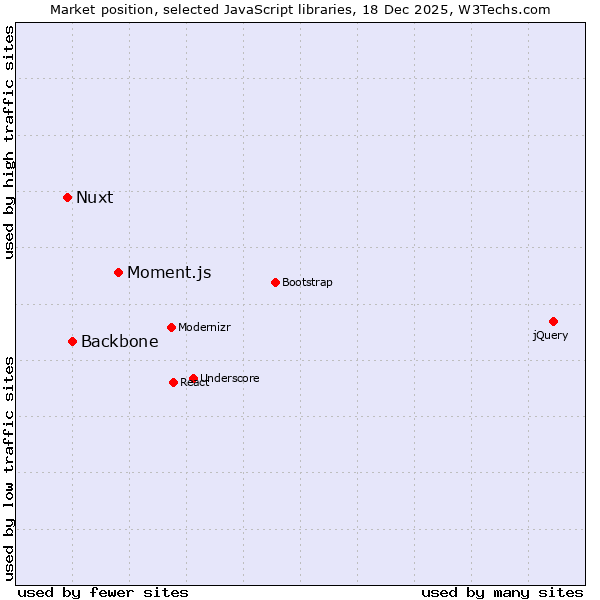 TechnologiesContent ManagementServer-side Languages Client-side Languages JavaScript Libraries CSS Frameworks Web Servers Web Panels Operating Systems Web Hosting Data Centers Reverse Proxies DNS Servers Email Servers SSL Certificate Authorities Content Delivery Traffic Analysis Tools Advertising Networks Tag Managers Social Widgets Site Elements Structured Data Markup Languages Character Encodings Image File Formats Top Level Domains Server Locations Content Languages | Technologies > JavaScript Libraries > Technology usage comparison Comparison of the usage statistics of Moment.js vs. Backbone vs. Nuxt for websitesThis report shows the usage statistics of Moment.js vs. Backbone vs. Nuxt as JavaScript library on the web. See technologies overview for explanations on the methodologies used in the surveys. Our reports are updated daily. Usage and market shareThis diagram shows the percentages of websites using the selected technologies. How to read the diagram: