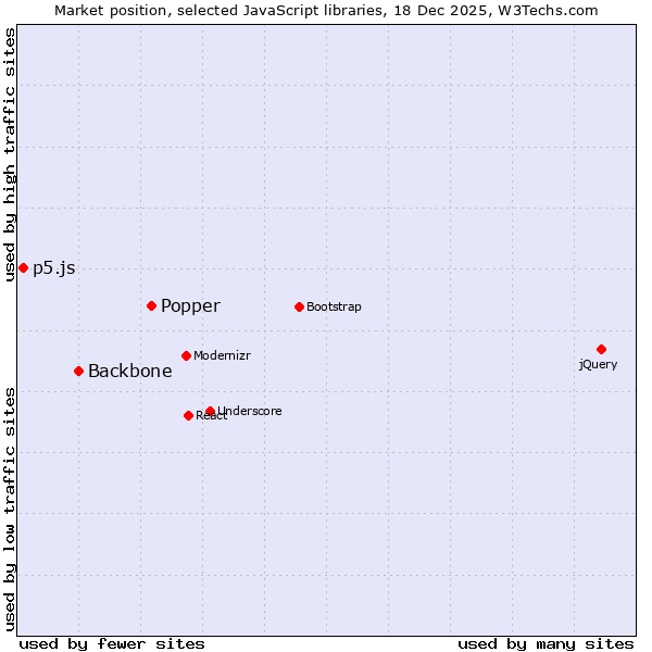 TechnologiesContent ManagementServer-side Languages Client-side Languages JavaScript Libraries CSS Frameworks Web Servers Web Panels Operating Systems Web Hosting Data Centers Reverse Proxies DNS Servers Email Servers SSL Certificate Authorities Content Delivery Traffic Analysis Tools Advertising Networks Tag Managers Social Widgets Site Elements Structured Data Markup Languages Character Encodings Image File Formats Top Level Domains Server Locations Content Languages | Technologies > JavaScript Libraries > Technology usage comparison Comparison of the usage statistics of Popper vs. Backbone vs. p5.js for websitesThis report shows the usage statistics of Popper vs. Backbone vs. p5.js as JavaScript library on the web. See technologies overview for explanations on the methodologies used in the surveys. Our reports are updated daily. Usage and market shareThis diagram shows the percentages of websites using the selected technologies. How to read the diagram: