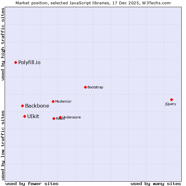 TechnologiesContent ManagementServer-side Languages Client-side Languages JavaScript Libraries CSS Frameworks Web Servers Web Panels Operating Systems Web Hosting Data Centers Reverse Proxies DNS Servers Email Servers SSL Certificate Authorities Content Delivery Traffic Analysis Tools Advertising Networks Tag Managers Social Widgets Site Elements Structured Data Markup Languages Character Encodings Image File Formats Top Level Domains Server Locations Content Languages | Technologies > JavaScript Libraries > Technology usage comparison Comparison of the usage statistics of UIkit vs. Backbone vs. Polyfill.io for websitesThis report shows the usage statistics of UIkit vs. Backbone vs. Polyfill.io as JavaScript library on the web. See technologies overview for explanations on the methodologies used in the surveys. Our reports are updated daily. Usage and market shareThis diagram shows the percentages of websites using the selected technologies. How to read the diagram: