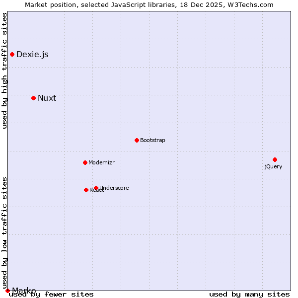TechnologiesContent ManagementServer-side Languages Client-side Languages JavaScript Libraries CSS Frameworks Web Servers Web Panels Operating Systems Web Hosting Data Centers Reverse Proxies DNS Servers Email Servers SSL Certificate Authorities Content Delivery Traffic Analysis Tools Advertising Networks Tag Managers Social Widgets Site Elements Structured Data Markup Languages Character Encodings Image File Formats Top Level Domains Server Locations Content Languages | Technologies > JavaScript Libraries > Technology usage comparison Comparison of the usage statistics of Nuxt vs. Dexie.js vs. Marko for websitesThis report shows the usage statistics of Nuxt vs. Dexie.js vs. Marko as JavaScript library on the web. See technologies overview for explanations on the methodologies used in the surveys. Our reports are updated daily. Usage and market shareThis diagram shows the percentages of websites using the selected technologies. How to read the diagram: