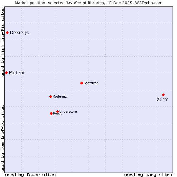 Historical trendThis diagram shows the historical trend in the percentage of websites using the selected technologies. Market positionThis diagram shows the market position of the selected technologies in terms of popularity and traffic compared to the most popular JavaScript libraries. More detailed statisticsYou can find extensive reports of JavaScript libraries in our JavaScript libraries market reports. Share this page | |||||||||||||||||||||||||||||||||||||||||||||||||||||||||||||||