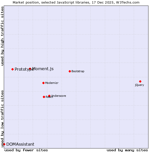 TechnologiesContent ManagementServer-side Languages Client-side Languages JavaScript Libraries CSS Frameworks Web Servers Web Panels Operating Systems Web Hosting Data Centers Reverse Proxies DNS Servers Email Servers SSL Certificate Authorities Content Delivery Traffic Analysis Tools Advertising Networks Tag Managers Social Widgets Site Elements Structured Data Markup Languages Character Encodings Image File Formats Top Level Domains Server Locations Content Languages | Technologies > JavaScript Libraries > Technology usage comparison Comparison of the usage statistics of Moment.js vs. Prototype vs. DOMAssistant for websitesThis report shows the usage statistics of Moment.js vs. Prototype vs. DOMAssistant as JavaScript library on the web. See technologies overview for explanations on the methodologies used in the surveys. Our reports are updated daily. Usage and market shareThis diagram shows the percentages of websites using the selected technologies. How to read the diagram: