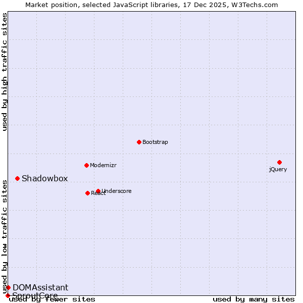 TechnologiesContent ManagementServer-side Languages Client-side Languages JavaScript Libraries CSS Frameworks Web Servers Web Panels Operating Systems Web Hosting Data Centers Reverse Proxies DNS Servers Email Servers SSL Certificate Authorities Content Delivery Traffic Analysis Tools Advertising Networks Tag Managers Social Widgets Site Elements Structured Data Markup Languages Character Encodings Image File Formats Top Level Domains Server Locations Content Languages | Technologies > JavaScript Libraries > Technology usage comparison Comparison of the usage statistics of Shadowbox vs. DOMAssistant vs. SproutCore for websitesThis report shows the usage statistics of Shadowbox vs. DOMAssistant vs. SproutCore as JavaScript library on the web. See technologies overview for explanations on the methodologies used in the surveys. Our reports are updated daily. Usage and market shareThis diagram shows the percentages of websites using the selected technologies. How to read the diagram: