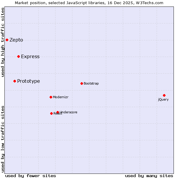 TechnologiesContent ManagementServer-side Languages Client-side Languages JavaScript Libraries CSS Frameworks Web Servers Web Panels Operating Systems Web Hosting Data Centers Reverse Proxies DNS Servers Email Servers SSL Certificate Authorities Content Delivery Traffic Analysis Tools Advertising Networks Tag Managers Social Widgets Site Elements Structured Data Markup Languages Character Encodings Image File Formats Top Level Domains Server Locations Content Languages | Technologies > JavaScript Libraries > Technology usage comparison Comparison of the usage statistics of Express vs. Prototype vs. Zepto for websitesThis report shows the usage statistics of Express vs. Prototype vs. Zepto as JavaScript library on the web. See technologies overview for explanations on the methodologies used in the surveys. Our reports are updated daily. Usage and market shareThis diagram shows the percentages of websites using the selected technologies. How to read the diagram: