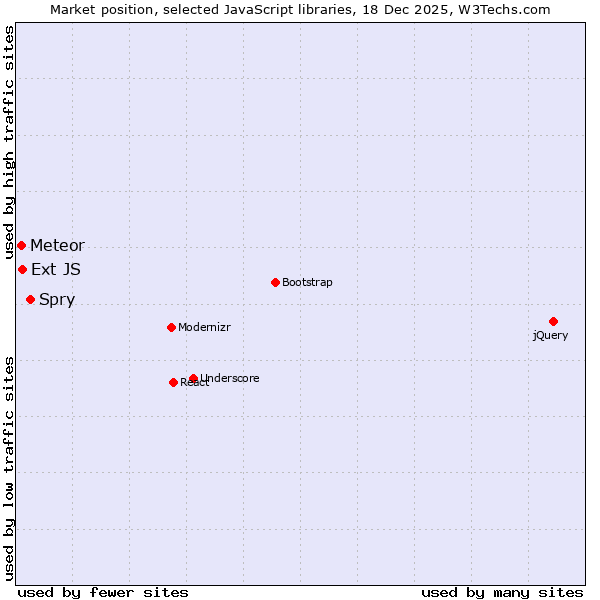 TechnologiesContent ManagementServer-side Languages Client-side Languages JavaScript Libraries CSS Frameworks Web Servers Web Panels Operating Systems Web Hosting Data Centers Reverse Proxies DNS Servers Email Servers SSL Certificate Authorities Content Delivery Traffic Analysis Tools Advertising Networks Tag Managers Social Widgets Site Elements Structured Data Markup Languages Character Encodings Image File Formats Top Level Domains Server Locations Content Languages | Technologies > JavaScript Libraries > Technology usage comparison Comparison of the usage statistics of Spry vs. Ext JS vs. Meteor for websitesThis report shows the usage statistics of Spry vs. Ext JS vs. Meteor as JavaScript library on the web. See technologies overview for explanations on the methodologies used in the surveys. Our reports are updated daily. Usage and market shareThis diagram shows the percentages of websites using the selected technologies. How to read the diagram: