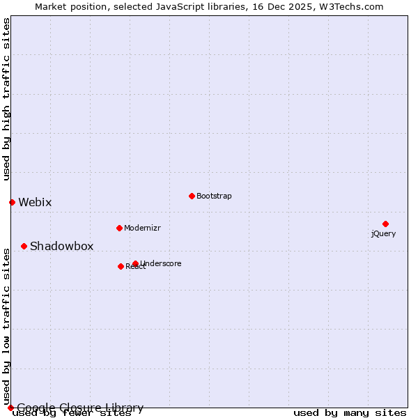 TechnologiesContent ManagementServer-side Languages Client-side Languages JavaScript Libraries CSS Frameworks Web Servers Web Panels Operating Systems Web Hosting Data Centers Reverse Proxies DNS Servers Email Servers SSL Certificate Authorities Content Delivery Traffic Analysis Tools Advertising Networks Tag Managers Social Widgets Site Elements Structured Data Markup Languages Character Encodings Image File Formats Top Level Domains Server Locations Content Languages | Technologies > JavaScript Libraries > Technology usage comparison Comparison of the usage statistics of Shadowbox vs. Webix vs. Google Closure Library for websitesThis report shows the usage statistics of Shadowbox vs. Webix vs. Google Closure Library as JavaScript library on the web. See technologies overview for explanations on the methodologies used in the surveys. Our reports are updated daily. Usage and market shareThis diagram shows the percentages of websites using the selected technologies. How to read the diagram:
