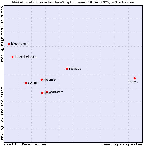 Historical trendThis diagram shows the historical trend in the percentage of websites using the selected technologies. Market positionThis diagram shows the market position of the selected technologies in terms of popularity and traffic compared to the most popular JavaScript libraries. More detailed statisticsYou can find extensive reports of JavaScript libraries in our JavaScript libraries market reports. Share this page | |||||||||||||||||||||||||||||||||||||||||||||||||||||||||||||||||||||||||||||||||||||||