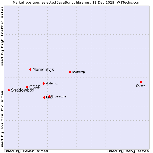 TechnologiesContent ManagementServer-side Languages Client-side Languages JavaScript Libraries CSS Frameworks Web Servers Web Panels Operating Systems Web Hosting Data Centers Reverse Proxies DNS Servers Email Servers SSL Certificate Authorities Content Delivery Traffic Analysis Tools Advertising Networks Tag Managers Social Widgets Site Elements Structured Data Markup Languages Character Encodings Image File Formats Top Level Domains Server Locations Content Languages | Technologies > JavaScript Libraries > Technology usage comparison Comparison of the usage statistics of Moment.js vs. GSAP vs. Shadowbox for websitesThis report shows the usage statistics of Moment.js vs. GSAP vs. Shadowbox as JavaScript library on the web. See technologies overview for explanations on the methodologies used in the surveys. Our reports are updated daily. Usage and market shareThis diagram shows the percentages of websites using the selected technologies. How to read the diagram: