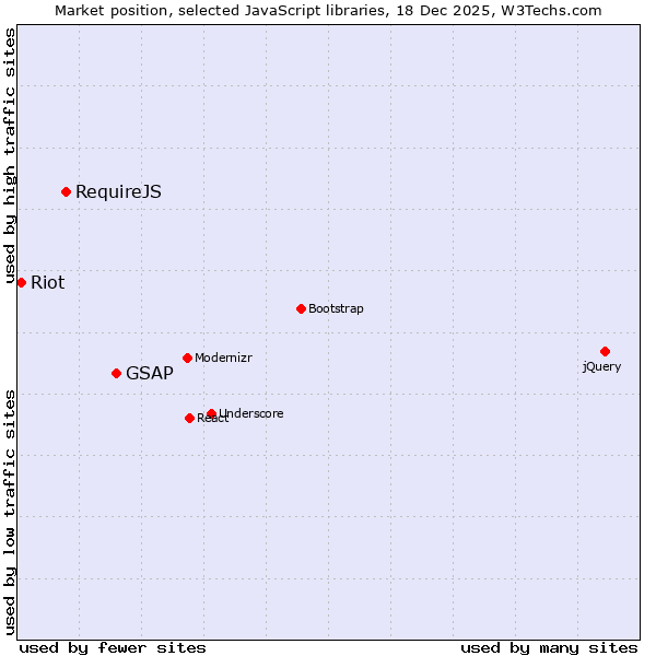 TechnologiesContent ManagementServer-side Languages Client-side Languages JavaScript Libraries CSS Frameworks Web Servers Web Panels Operating Systems Web Hosting Data Centers Reverse Proxies DNS Servers Email Servers SSL Certificate Authorities Content Delivery Traffic Analysis Tools Advertising Networks Tag Managers Social Widgets Site Elements Structured Data Markup Languages Character Encodings Image File Formats Top Level Domains Server Locations Content Languages | Technologies > JavaScript Libraries > Technology usage comparison Comparison of the usage statistics of GSAP vs. RequireJS vs. Riot for websitesThis report shows the usage statistics of GSAP vs. RequireJS vs. Riot as JavaScript library on the web. See technologies overview for explanations on the methodologies used in the surveys. Our reports are updated daily. Usage and market shareThis diagram shows the percentages of websites using the selected technologies. How to read the diagram: