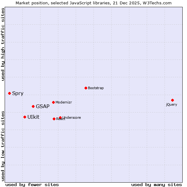 TechnologiesContent ManagementServer-side Languages Client-side Languages JavaScript Libraries CSS Frameworks Web Servers Web Panels Operating Systems Web Hosting Data Centers Reverse Proxies DNS Servers Email Servers SSL Certificate Authorities Content Delivery Traffic Analysis Tools Advertising Networks Tag Managers Social Widgets Site Elements Structured Data Markup Languages Character Encodings Image File Formats Top Level Domains Server Locations Content Languages | Technologies > JavaScript Libraries > Technology usage comparison Comparison of the usage statistics of GSAP vs. UIkit vs. Spry for websitesThis report shows the usage statistics of GSAP vs. UIkit vs. Spry as JavaScript library on the web. See technologies overview for explanations on the methodologies used in the surveys. Our reports are updated daily. Usage and market shareThis diagram shows the percentages of websites using the selected technologies. How to read the diagram: