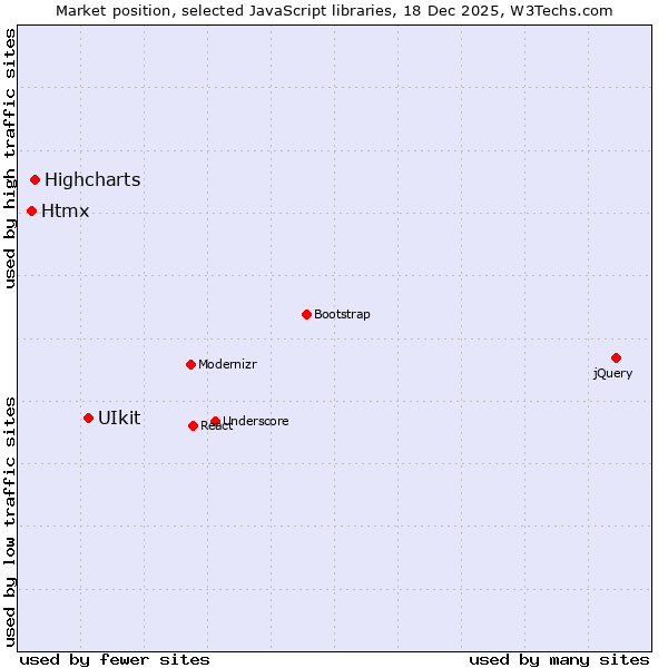 TechnologiesContent ManagementServer-side Languages Client-side Languages JavaScript Libraries CSS Frameworks Web Servers Web Panels Operating Systems Web Hosting Data Centers Reverse Proxies DNS Servers Email Servers SSL Certificate Authorities Content Delivery Traffic Analysis Tools Advertising Networks Tag Managers Social Widgets Site Elements Structured Data Markup Languages Character Encodings Image File Formats Top Level Domains Server Locations Content Languages | Technologies > JavaScript Libraries > Technology usage comparison Comparison of the usage statistics of UIkit vs. Highcharts vs. Htmx for websitesThis report shows the usage statistics of UIkit vs. Highcharts vs. Htmx as JavaScript library on the web. See technologies overview for explanations on the methodologies used in the surveys. Our reports are updated daily. Usage and market shareThis diagram shows the percentages of websites using the selected technologies. How to read the diagram: