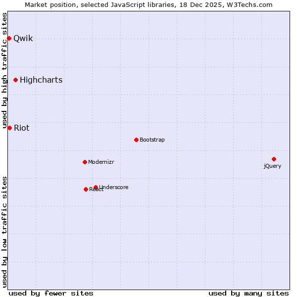 TechnologiesContent ManagementServer-side Languages Client-side Languages JavaScript Libraries CSS Frameworks Web Servers Web Panels Operating Systems Web Hosting Data Centers Reverse Proxies DNS Servers Email Servers SSL Certificate Authorities Content Delivery Traffic Analysis Tools Advertising Networks Tag Managers Social Widgets Site Elements Structured Data Markup Languages Character Encodings Image File Formats Top Level Domains Server Locations Content Languages | Technologies > JavaScript Libraries > Technology usage comparison Comparison of the usage statistics of Highcharts vs. Riot vs. Qwik for websitesThis report shows the usage statistics of Highcharts vs. Riot vs. Qwik as JavaScript library on the web. See technologies overview for explanations on the methodologies used in the surveys. Our reports are updated daily. Usage and market shareThis diagram shows the percentages of websites using the selected technologies. How to read the diagram: