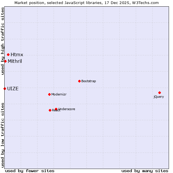 TechnologiesContent ManagementServer-side Languages Client-side Languages JavaScript Libraries CSS Frameworks Web Servers Web Panels Operating Systems Web Hosting Data Centers Reverse Proxies DNS Servers Email Servers SSL Certificate Authorities Content Delivery Traffic Analysis Tools Advertising Networks Tag Managers Social Widgets Site Elements Structured Data Markup Languages Character Encodings Image File Formats Top Level Domains Server Locations Content Languages | Technologies > JavaScript Libraries > Technology usage comparison Comparison of the usage statistics of Htmx vs. Mithril vs. UIZE for websitesThis report shows the usage statistics of Htmx vs. Mithril vs. UIZE as JavaScript library on the web. See technologies overview for explanations on the methodologies used in the surveys. Our reports are updated daily. Usage and market shareThis diagram shows the percentages of websites using the selected technologies. How to read the diagram: