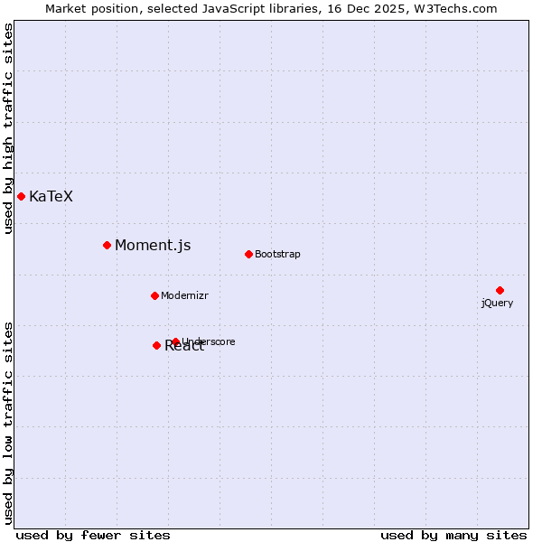 TechnologiesContent ManagementServer-side Languages Client-side Languages JavaScript Libraries CSS Frameworks Web Servers Web Panels Operating Systems Web Hosting Data Centers Reverse Proxies DNS Servers Email Servers SSL Certificate Authorities Content Delivery Traffic Analysis Tools Advertising Networks Tag Managers Social Widgets Site Elements Structured Data Markup Languages Character Encodings Image File Formats Top Level Domains Server Locations Content Languages | Technologies > JavaScript Libraries > Technology usage comparison Comparison of the usage statistics of React vs. Moment.js vs. KaTeX for websitesThis report shows the usage statistics of React vs. Moment.js vs. KaTeX as JavaScript library on the web. See technologies overview for explanations on the methodologies used in the surveys. Our reports are updated daily. Usage and market shareThis diagram shows the percentages of websites using the selected technologies. How to read the diagram: