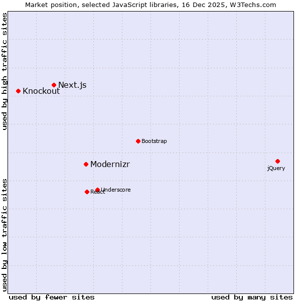 TechnologiesContent ManagementServer-side Languages Client-side Languages JavaScript Libraries CSS Frameworks Web Servers Web Panels Operating Systems Web Hosting Data Centers Reverse Proxies DNS Servers Email Servers SSL Certificate Authorities Content Delivery Traffic Analysis Tools Advertising Networks Tag Managers Social Widgets Site Elements Structured Data Markup Languages Character Encodings Image File Formats Top Level Domains Server Locations Content Languages | Technologies > JavaScript Libraries > Technology usage comparison Comparison of the usage statistics of Modernizr vs. Next.js vs. Knockout for websitesThis report shows the usage statistics of Modernizr vs. Next.js vs. Knockout as JavaScript library on the web. See technologies overview for explanations on the methodologies used in the surveys. Our reports are updated daily. Usage and market shareThis diagram shows the percentages of websites using the selected technologies. How to read the diagram: